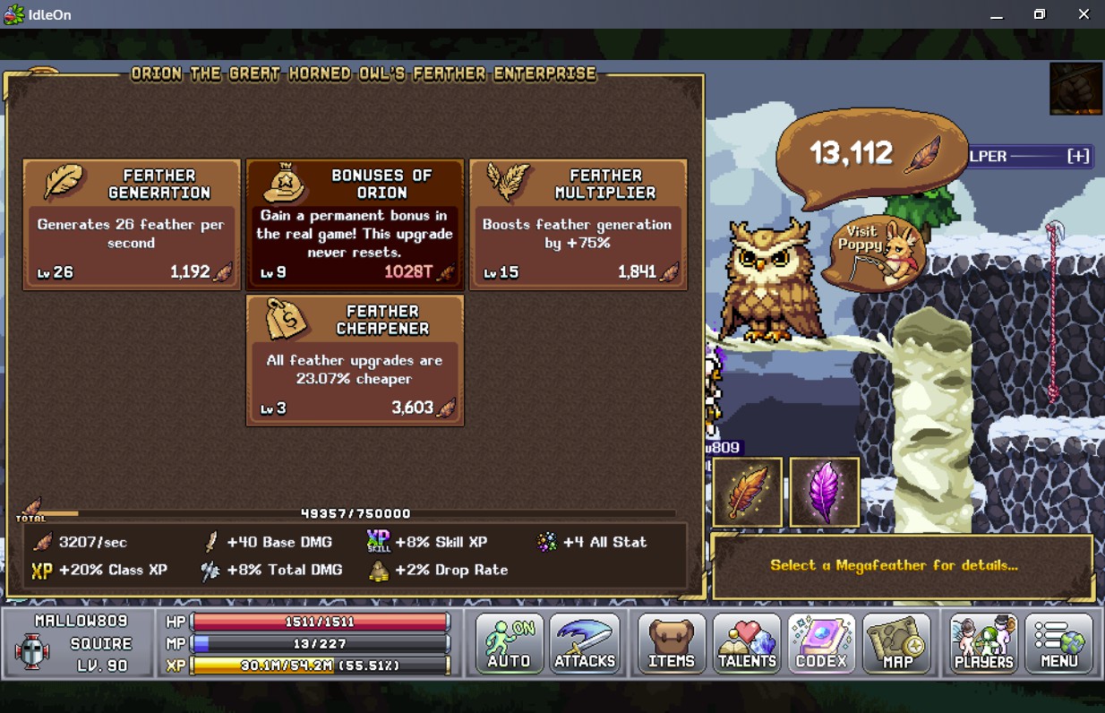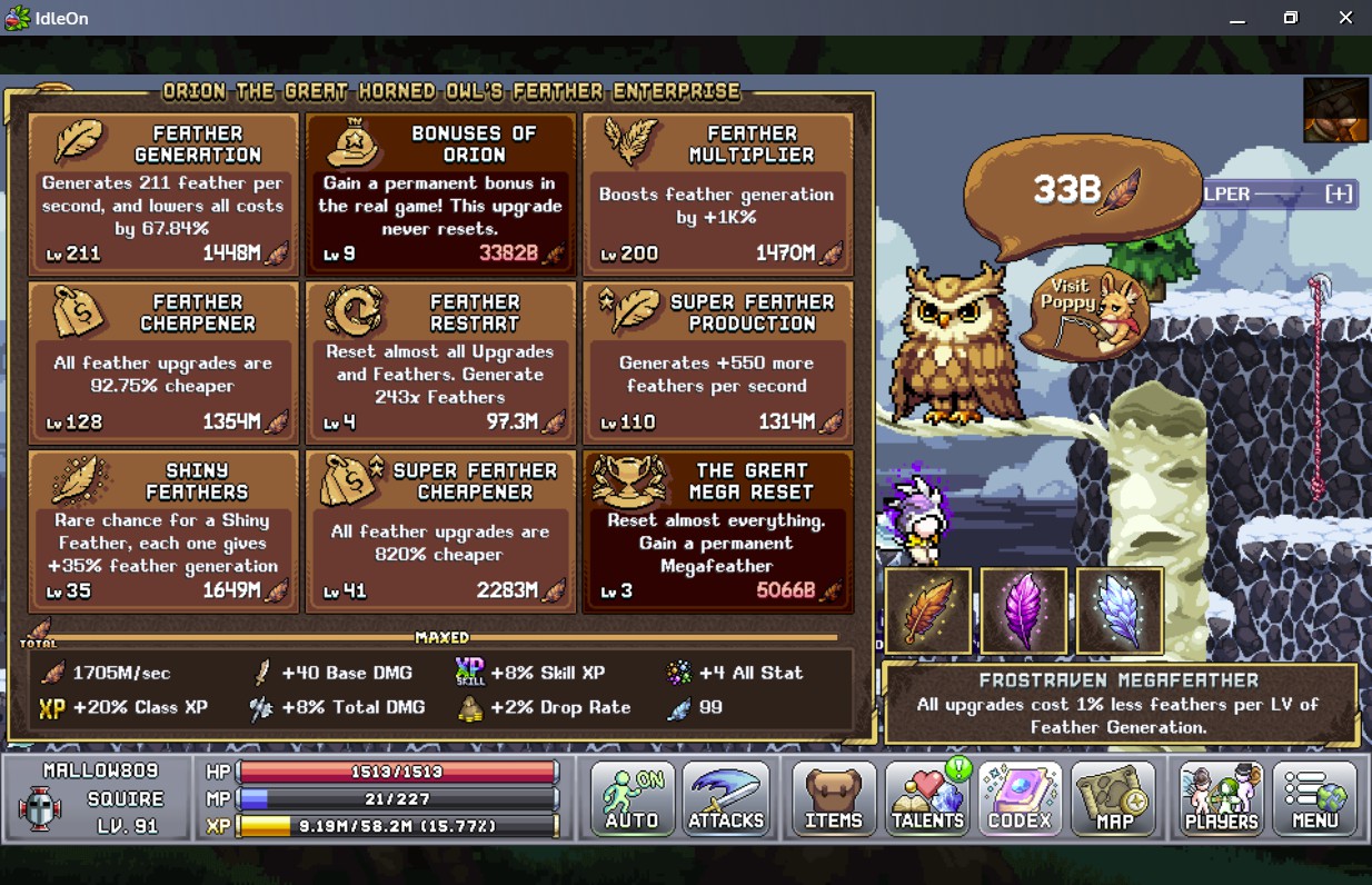 これをするとFEATHER RESTARTで増加した倍率はリセットされますが、それとは別に羽の生産効率やボーナスに影響するバフが入手できます。